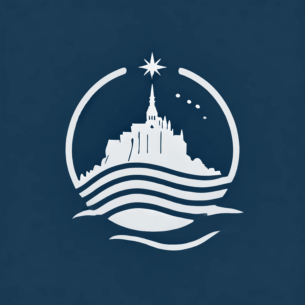Le logo ci-dessous, spécifiquement créé pour accompagner le projet, évoque la silhouette emblématique du Mont-Saint-Michel, les flux marins, et l’étoile-guide qui relie la terre au ciel. Il sera utilisé dans tous les supports de communication liés à l’œuvre.